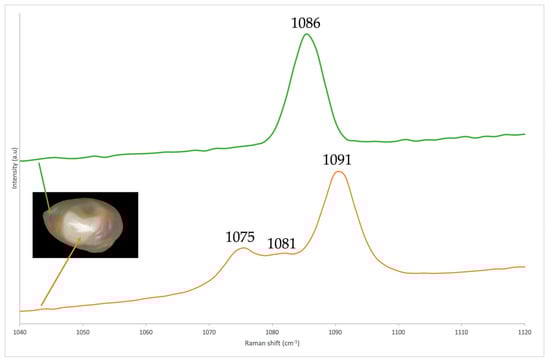 One of the studied natural freshwater pearls presented a section with intense orange luminescence under X-rays; and phosphorescence which lasted for about 3 seconds (Figure 10). Orange luminescence activated by CL was previously observed on some cultured freshwater pearls, without bead, from China and this was attributed to calcite emitting Mn2+ [6]. Raman spectra acquired on the section where orange luminescence presents (and which, macroscopically and under optical microscope, appears with different lustre than the rest of the sample; refer to Figure 10A) have shown Raman bands at around 1091, 1081 and 1075 cm−1 due to ν1 symmetric stretching of carbonate ions in vaterite (Figure 11) and not at 1086 cm−1 due to ν1 symmetric stretching of carbonate ions in aragonite as on the section where medium yellow-green luminescence was observed [45]. CL and X-ray induced luminescence spectra of Mn2+ in calcite and vaterite are very close, which suggest a 6-fold coordination of oxygen around both calcite and vaterite [42]. Sections of vaterite were already previously identified in freshwater cultured pearls without bead from Japan and China [45,46,47]; but not in natural freshwater pearls.