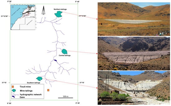 Tiouit mine, discovered in 1947, is located in the eastern part of Jebel Saghro in the Anti-Atlas Mountains, Morocco, about 40 km south east of the city of Boumalne Dades. The Tiouit deposits were exploited intermittently by different companies: “Comansour” (1950–1956), “Westfield” (1959–1964), and finally the “SODECAT company” (1975–1996) [36]. The mineralization was identified as intrusive granite consisting of native gold associated with chalcopyrite (CuFeS2), pyrite (FeS2), sphalerite (ZnS), galena (PbS), magnetite (Fe3O4), arsenopyrite (FeAsS), bornite (Cu5FeS4), luzonite (Cu3AsS4), gold (Au), and gray copper (X12Y4S13, with X: Ag, Cu, Fe, Hg, Zn and Y: As, Sb, Te). The ore processing involved crushing and milling followed by a bulk froth flotation process [37,39,40]. Over the duration of the entire mining operation, more than 740,000 tons of mine tailings (168,000 tons in the northern tailings pond, 346,000 tons in the central tailings pond, and 229,000 tons in the southern tailings pond) were deposited at the surface without any reclamation measures (Figure 1). Larger volumes of mine wastes were discharged directly into the Tiouit river. Many rainwater ravines were created in the tailings deposit, which caused their dispersion along the Tiouit river.