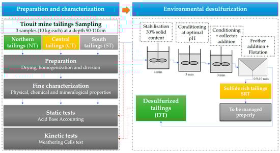 Tailings samples were collected after excavating trenches in the tailings ponds. Sampling sites were selected, based on field observations, to obtain fresh, non-oxidized tailings. Tailings samples labeled ST, CT, and NT were collected from the southern, central, and northern tailings ponds, respectively. Samples were collected at depths between 90 and 110 cm. All samples were carefully conditioned, and immediately stored in double-sealed plastic bags from which the air was evacuated to prevent contact with oxygen. A small, representative sample from each pond was stored at low temperature (5 °C) and at their original saturation (without drying) for kinetic testing. The methodology followed in this study is compiled in Figure 2. The aim was to desulfurize the sampled tailings to reduce their environmental impact. The floated sulfide-rich tailings (SRT) needed to be properly managed due to their high concentration of sulfides.