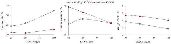 The recovery yield of sulfur-bearing minerals was relatively high (68–74 wt %) with very negligible amounts of residual sulfides. Achieving a maximum recovery of around 73 wt % was possible with collector concentrations as low as 50 g/t and without any activators. Concentrate weight proportions were between 2.8% (for a collector concentration of 100 g/t and 100 g/t CuSO4) and 4.7% (for a collector concentration of 25 g/t and without CuSO4).
