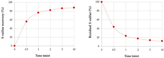 Results achieved using the optimal flotation conditions are presented in Figure 4. This experiment showed that the residual sulfur content in the tailings was <24% after 1 min and 13% after 10 min, which corresponds to a recovery of approximately 76% after 1 min and 87% after 10 min. The weight percentage of the concentrate was 2.9% after 1 min and 5.3% after 10 min.
