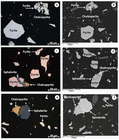 The identified sulfide minerals within the concentrate obtained from the flotation test; optical microscopy (a,c,e) and scanning electron microscopy (SEM) (b,d,f).