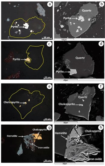 The identified sulfide minerals within the desulfurized tailings obtained from the flotation test; optical microscopy (a,c,e,g) and SEM (b,d,f,h).