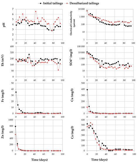 Eh values were slightly higher for the initial ST compared to the desulfurized tailings, indicating an oxidizing environment in agreement with their high sulfur content (152–296 mV and 91–251 mV, respectively for initial tailing and desulfurized tailing samples) (Figure 7). For electrical conductivity (EC) and all dissolved elements, the measured values in the first nine recovered leachates showed the highest values compared to the subsequent rinsing cycles for both samples. The highest EC values (6270 µS/cm for the two samples) and dissolved elements (SO42−, Fe, Cu, Zn, Ca) were recorded at the beginning of the tests, presumably due to the dissolution of oxidation products generated by in situ weathering. In fact, EC and dissolved elements resulting from sulfide oxidation (SO42−, Fe, Cu, Zn) and neutralization reactions (Ca, Mg) decreased and stabilized after the 9th cycle of the test, reaching a steady state (Figure 7). The EC and dissolved ions associated with oxidation/neutralization reactions were higher in the leachates recovered from the initial tailings sample than those of the desulfurized tailings (Figure 7), indicating the effectiveness of the desulfurization process at improving the environmental behavior of the tested mine tailings [56,57].