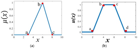 Points of triangular membership functions (MF) (a), and trapezoidal MF (b).