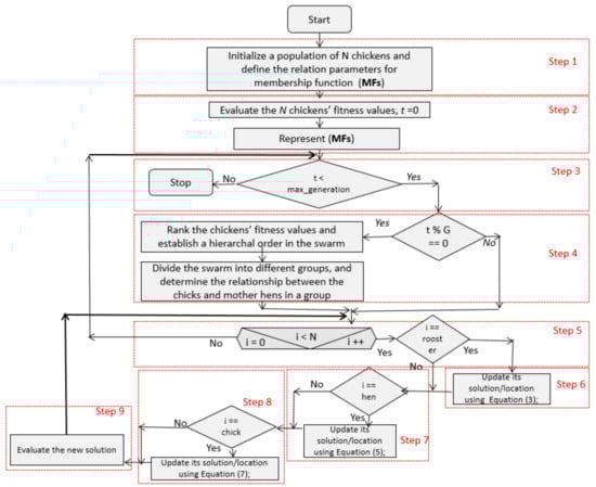 | 5. Rank the chickens’ fitness values and establish a hierarchal order in the swarm; |