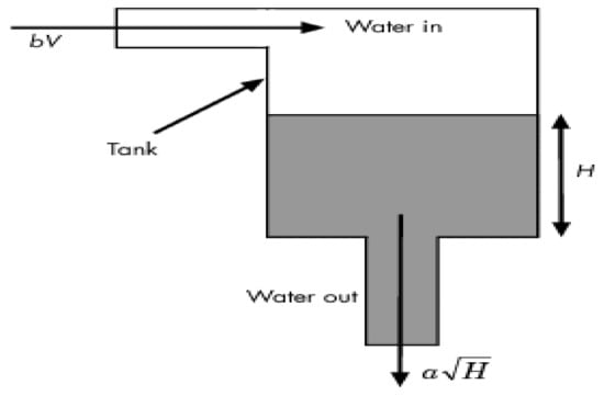 where is the volume of water in the tank, is the cross-sectional area of the tank, is a constant related to the flow rate into the tank, and is a constant related to the flow rate out of the tank. The equation describes the height of water as a function of time, due to the difference between flow rates into and out of the tank.