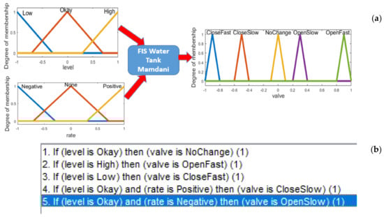 In this algorithm each particle represented a possible solution in the problem. For example, in the case of the first control problem called water tank controller, the proposed fuzzy logic system (FLS) has triangular membership functions (MF) at the inputs and outputs. Two type of MFs are implemented in this paper. The first is a triangular MF that depends on three parameters, which are , and as given by the Equation (1), where and represents the feet of the triangle and the locates the peak, and the second is a trapezoidal MF that depends on four parameters which are , , and , as given by Equation (2). This triangular and trapezoidal MFs are represented graphically in Figure 2a,b, respectively.