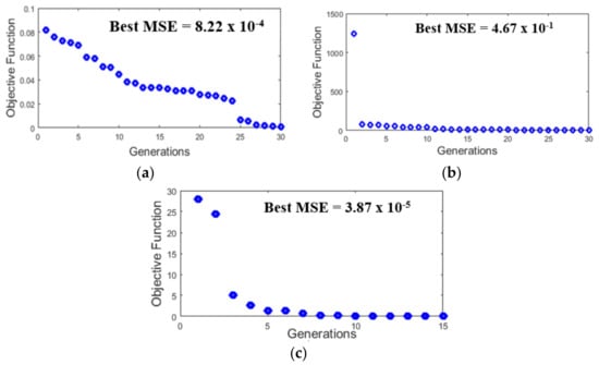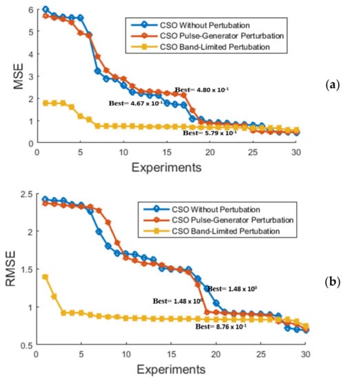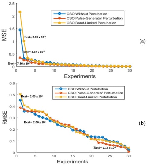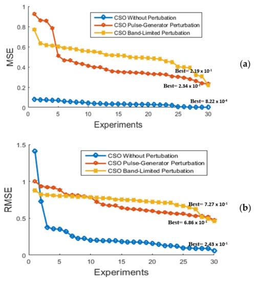 Figure 22, Figure 23 and Figure 24 illustrate the behavior of proposed implementation of the CSO algorithm in the design of the MFs to create the FLS for the fitness function (MSE) and RMSE of the 30 experiments for each control problem, respectively.