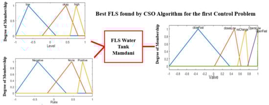 A Type-1 FLS was optimized with the CSO algorithm, and it is necessary to have a particle (cock, hen or chick) with a size to optimize the membership functions (MFs). In this case it is called a vector representing the possible best distribution in the MFs for the first study case called water tank controller, as shown in Figure 5. The vector has 33 positions to optimize, because this control problem has two inputs each with three triangular MFs, and one output with five triangular MFs.
