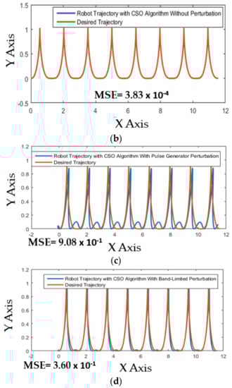 Figure 25 shows the best trajectory of the autonomous mobile robot found by CSO algorithm in the design of the MFs of the FLS simulated for each type of experiment; without perturbation, with pulse generator and with band-limited perturbation, respectively.