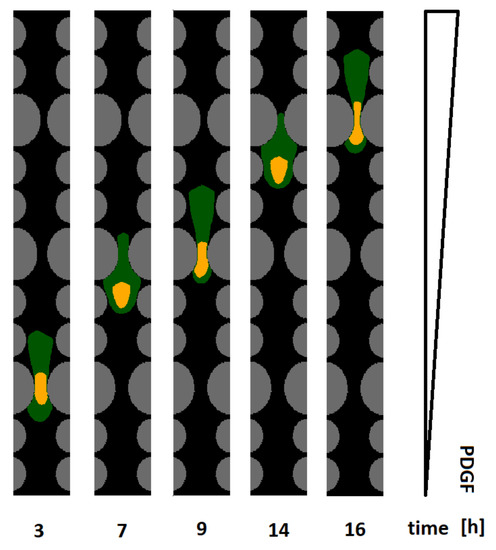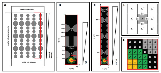 The Cellular Potts model (CPM) is a grid-based stochastic approach that realistically preserves the identity of cell-scale elements and describes their behavior and mutual interactions in energetic terms and constraints. An extended version of the CPM was employed here to schematically reproduce cell migratory behavior within the two types of microfluidic-based devices developed in [18,19]. As shown in Figure 1A, both experimental systems are composed of dozens of arrays of aligned polymeric pillars, which form a series of parallel channels. Such structural elements are fixed and represent a constriction for cell movement because they limit the free space and form bottlenecks: their dimensions and distributions can be varied to mimic different patterns of spatial limitations. An extended group of cells, initially disposed just outside the entrance of the channels, then individually moves up to a chemical gradient, which is established by the diffusion of a molecular factor from a sink reservoir located on the opposite side of the devices; see, again, Figure 1A.