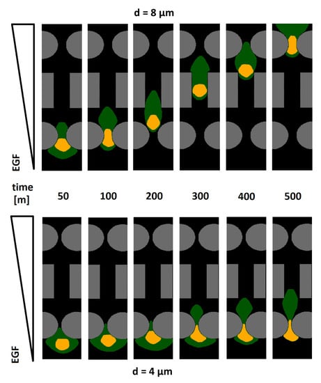 Figure 3. Simulation image sequences of the cell invading the virtual migratory channel in the representative cases d = 8 µm (top panels) and d = 4 µm (bottom panels), d being the distance between each pair of round pillars. We remark that, for d = 8 µm, the cell was able to fully invade the microfluidic structure in only ∼30% of cases, while for d = 4 µm, this never happened (cf. Figure 2). We remark that the initial diameter of the nucleus was d N = 14 µm.