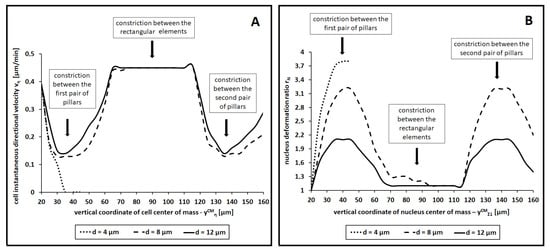 We further quantified the migration profile of a cell with an enhanced nuclear elasticity (i.e., with ν N = 0.7 ). As shown in panel (A) of Figure 9, an asymmetry emerged between the velocity of the overall cell, v η , and the velocity of its organelle, v N . On one hand, as expected, the cell had a maximal speed when crawling between the pairs of smaller pillars. Velocity reductions were instead observed when it approached and passed between the three pairs of larger pillars: in particular, the decrements depended on the width of the constrictions. On the other hand, the speed of the nucleus (i) was constant in the case of locomotion within larger spaces, (ii) completely stalled as a constriction impeded its forward movement, (iii) reached an instantaneous peak once the center of the intracellular compartment had passed the midpoint of the pore, and (iv) finally decreased back to the regime value. The underlying rationale, supported by the numerical results summarized in Figure 5 (middle panel), is the following: once the organelle had passed the midpoint of a constriction, the lateral inward compressive forces temporarily aligned in the direction of cell movement. An instantaneous push then emerged, which allowed the nucleus to rapidly slip out from the constriction.
