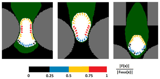 We finally calculated the force acting on any nuclear border site by adapting the algorithmic procedure described and employed in [45]. In particular, we started with the consideration that local forces can be related to the negative gradient of the Hamiltonian H, i.e., F ( x ) = ( F x ( x ) , F y ( x ) ) = H = H / x , H / y , x Ω being a generic lattice site. We then employed a centered approximation to the first partial derivative, also observing that the nuclear cluster could extend or retract in any of the two principal directions by a small step | x | (the characteristic size of the domain grid elements). As a result, we obtained that, for each x such that σ ( x ) = 1 ,