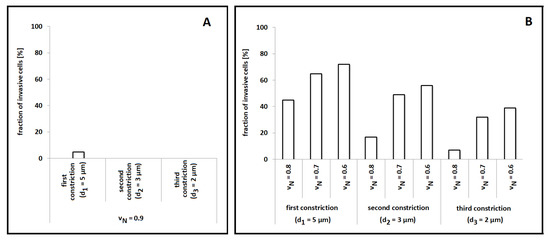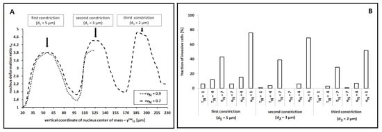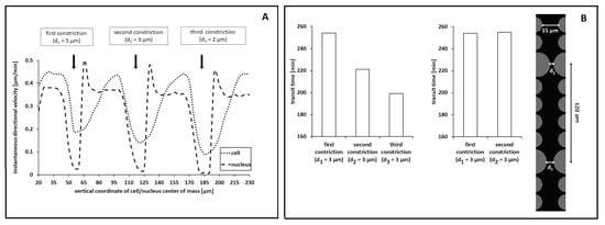 We then assessed whether successful passages through subsequent equal constrictions facilitated cell migration. We indeed compared the transit time within each pore in the case of a channel characterized by d 1 = d 2 = d 3 = 3 µm (i.e., by d 1 / d N = d 2 / d N = d 3 / d N 0.18 ). Additionally, in this case, we fixed ν N = 0.7 . As it is possible to see from Figure 9B (left graph), the virtual cell showed a trend towards faster dynamics in the case of transmigration between the second and the third pair of large pillars. A possible explanation relies on the residual deformation that characterized the nucleus after its passage within a constriction, as previously captured in Figure 5B and Figure 9A.