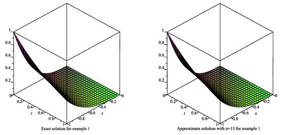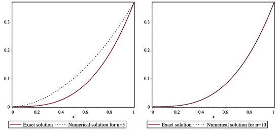 Then, is obtained by combining these matrices. Thus, we obtain the coefficient matrix . As we perform the method for different n values, we obtain n different FBSS. All calculations are done using the Maple program. The results for , 10, , and are given in Table 1. The absolute errors are graphed in Figure 1. Table 2 show the absolute errors between consecutive approximations. The exact and approximate solutions with are graphed in Figure 2. The values of error functions and the exact solution, at time , are given in Table 3 and graphed in Figure 3. The upper bounds of absolute error at time are given in Figure 4. A comparison of the method with the numerical methods in [16,18] is made for . The absolute error for with the errors obtained by the corrected FBSSs are given in Table 4. We can say that increasing n yields better approximation results and the method provides better results. From Table 2, we deduce that the absolute error can be estimated approximately by the difference between and From Table 3, we can see the method gives more accurate results than the methods in [16,18] for . From Table 4, increasing m yields more accurate corrected approximate solutions. Table 5 shows the error norms , resulting with CPU time (in seconds) used in the Maple program to find the numerical solutions for different n values. We provide the stability results for the method for some n values in Table 6. Increasing n gives the condition numbers which are increasing. It can be said that the approximate solutions will be more stable around by using both the theoretical upper bounds and the numerical results. The method produces approximately as a condition number. For , the solutions will be more sensitive to small variations since the number of conditions is large. Thus, around , we can say that the method works well for this problem.