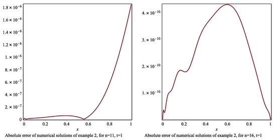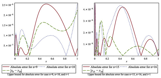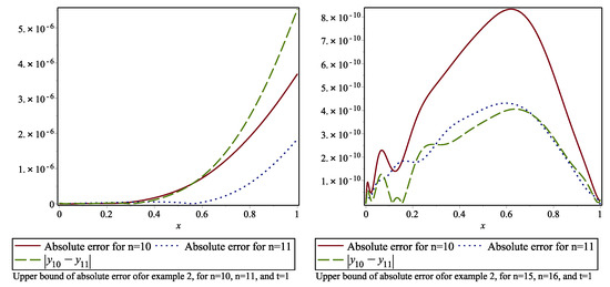 We perform the method for , 10 and The results are given in Table 7. The absolute errors are graphed in Figure 5. A comparison of the method with the numerical method in [17] is given in Table 7. We can say that increasing n yields better approximation results and the method provides better results. The method gives more accurate results than the method in [17]. From Table 8, we conclude that the absolute error can be bounded approximately by The absolute error for with the errors obtained by the corrected FBSSs are given in Table 9. The absolute errors for and at time are given in Figure 6. The errors with their upper bounds at are given in Figure 7. Table 10 shows the error norms , , resulting with CPU time (in seconds) used in the Maple program to find FBSSs for different n values. The method again gives approximately as a condition number. Therefore, around , we can say from Table 11 that the method produces more stable approximations for this problem.