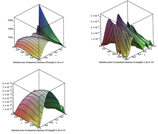 The absolute errors for Example 2, with , and .