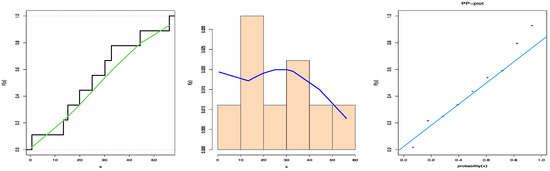 We explain how to conduct a goodness-of-fit test for the transformer insulation data and the proposed WE distribution based on PTIICS in the following subsection. The empirical cdf, the histogram of the pdf, and PP plots are displayed in Figure 2.