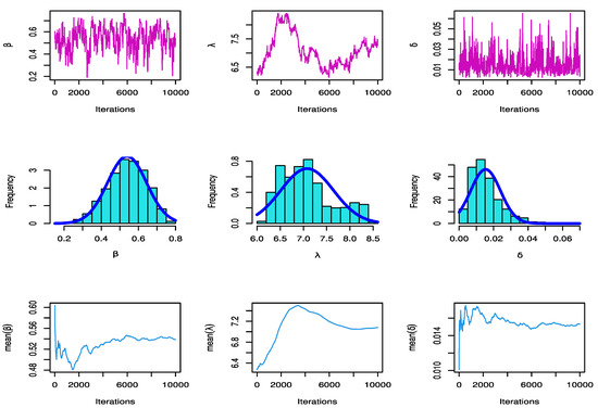 Figure 3 shows the history plots, estimated marginal posterior density, and MCMC convergence of , and .