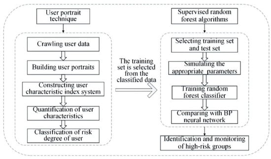 After the outbreak of negative public opinions of an enterprise due to poor user experiences, monitoring high-risk users involves monitoring and recognizing those users participating in negative public opinion discussions. Firstly, user data in the network are crawled and classified by user portrait technology. Then, supervised random forest algorithms are adopted to identify and monitor high-risk groups. The overall framework of the paper is shown in Figure 1.