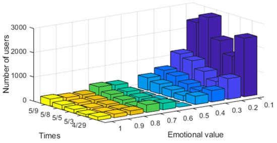 Figure 3 shows that in the initial stage of the “Hive Box charges”, most users’ emotional tendency was less than 0.1, a few users’ emotional value was 0.5, and a small number of users’ emotional value was more than 0.5. According to the calculation, 86.19% of users’ emotional value was less than 0.5, which shows that most users held a negative emotional tendency towards this event, while only a small number of users held a positive attitude, and almost no users held a neutral attitude. Subsequently, on 8 May, a number of communities in Hangzhou and Shanghai jointly boycotted Hive Box, and most of the negative emotions of users also reached a peak. It can be seen that this event had a great impact on the corporate image, and the user experience was very poor. In such a case, Hive Box enterprise would need to take immediate strategies to improve the user experience.