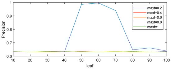 As can be seen from Figure 4, when the training sample is small, the accuracy of recognition of the high-risk population fluctuates greatly. However, when the training sample is larger than 1000, the recognition accuracy fluctuates only slightly. Therefore, in reality, the high-risk population monitoring and identification model requires at least 1000 pieces of data. Since there are enough data crawled in this paper, 10,000 pieces of data were selected as the training sample. In addition, with the increase in the number of decision trees in the random forest, the recognition accuracy is further improved, but at the same time, the running speed needs to be taken into account. Therefore, nTree = 10 was selected for training. As shown in Figure 5, only when maxf = 0.2 will the prediction accuracy change, and when leaf =60, the identification accuracy will be the highest. Therefore, in this case, our simulation set the parameters maxf = 0.2 and leaf = 60. Based on the above simulation results, the parameter settings are shown in Table 5 below.