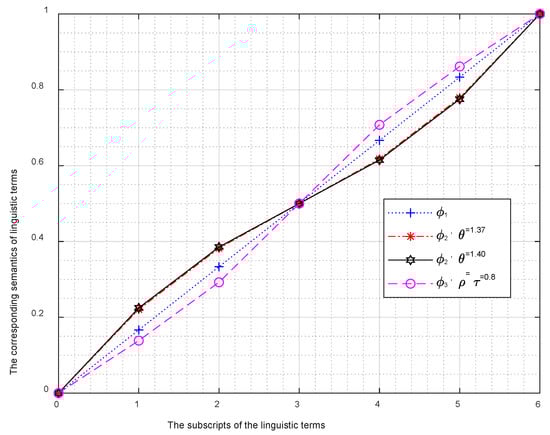 In the evaluation process, an expert uses LTs directly rather than their corresponding semantics. In general, the simplest way to deal with LTs is to use the levels of LTs directly. However, in different semantics decision-making environments, LTs have some differences in expressing evaluations. To resolve these issues, Wang et al. [] defined the LSF to deal with linguistic information. According to the decision-making environment, experts can consider different LSFs, which express available linguistic information more flexibly and precisely in different semantic situations.