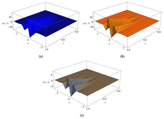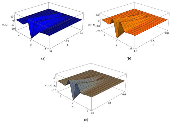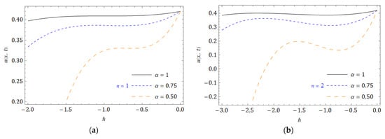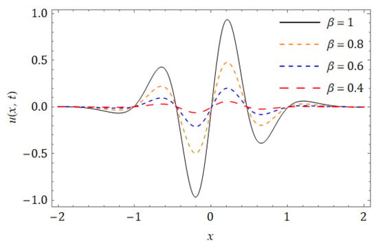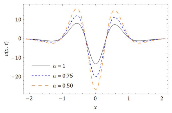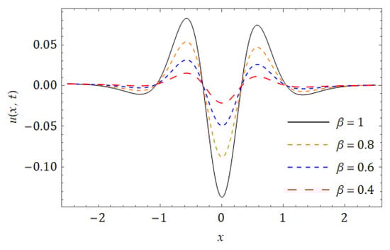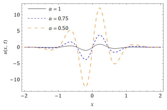 Similarly, we present Case II (i.e., fractional Gardner–Ostrovsky equation). For the change in fractional values of the order, we capture the response in Figure 5 and Figure 6. The effect of the small dispersion term in the FGO equation is cited in Figure 7. In Figure 2, we have a diverse change in between the range of and with . With the change in within the range of and 1 for this case, we can observe peak variations with the same values that we observe for with fractional order in Figure 3, and similarly for Case II in Figure 6 and Figure 7. For Case I and II, we respectively presented -curves in Figure 8.These types of studies can influence researchers to investigate physical phenomena.
