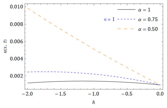 Here, we capture the physical nature of two cases with different fractional order, small-scale dispersion, and homotopy parameters. It is essential to illustrate the effect of the fractional operator incorporated in the considered model. For Case I, we present the surfaces of fractional values of the order in Figure 1, and then it is illustrated in Figure 2 with a particular value of time . In the Ostrovsky equation, the dispersion term plays a pivotal role and its effect is presented in Figure 3 with attained results. The main advantage of the considered scheme is the association of homotopy parameters (n and ). They play a critical role in the archiving solution for the modulation of convergence. For Case I we presented -curves in Figure 4.