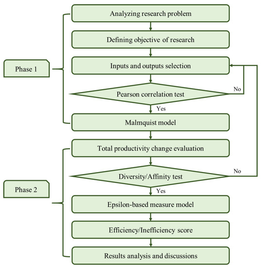 In this paper, an integrated DEA Malmquist and EBM model are applied for efficiency assessment of the Vietnamese’s top 14 seaport terminal companies for the period 2015–2020. The research process consists of two main phases, as can be seen in Figure 1. In the first phase, the DEA Malmquist model is used to assess the total productivity change through technical efficiency change (catch-up) and technological investment (frontier-shift) based on the selected inputs (total assets, owner’s equity, liabilities, operation expense) and outputs (revenue, net profit). Before applying the DEA Malmquist model, Pearson correlation is checked to ensure the homogeneity and isotonicity of the dataset. In the second phase, the EBM model is used to calculate the efficiency and inefficiency score of DMUs. The indexes of diversity and affinity coefficient are verified before using the EBM model.