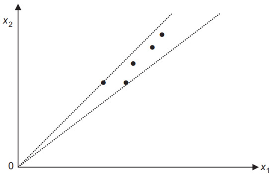 Figure 2 shows the scattering of the observed dataset with low dispersion () that implies the EBM model is changed to the CCR model. Meanwhile, Figure 3 shows the scattering of the observed dataset with low dispersion (), which implies that the EBM model is changed to the SBM model. Before applying the EBM model, the affinity index, which is used for measuring the similarity among input and output variables, is checked. Let and denote diversity index and affinity index between two variables, respectively. The EBM model need to satisfy the conditions, which are , and , according to Tone and Tsutsui [17].