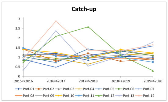 The technical efficiency changes of the DMUs over time are expressed by the catch-up index shown in Table 4 and Figure 4. Figure 4 depicts the evolution of the catch-up indexes for all port companies and Table 4 reports the detailed catch-up values. Catch-up index, with scores >1 and <1, respectively, corresponds to the progress and regress in technical efficiency of DMUs. According to Table 4, all of the DMUs achieved progressive technical efficiency on average (average catch-up indexes >1) over the entire period 2015–2020, leading to the overall average catch-up = 1.1414. Among these, port-14 (1.6325), port-12 (1.3641), and port-10 (1.2387) are the three DMUs with the best technical efficiency improvement on average during 2015–2020. In the meantime, port-04 (1.0040), port-02 (1.0206), and port-06 (1.0251) are the least effective operators on average. From Figure 4, we note that port-14 and port-12 show the most fluctuating performances during the research period, as does port-13. Specifically, port-13 and port-14 reached their peaks in technical efficiency during the 2016–2017 period, with catch-up indexes of 2.3894 and 2.8818, respectively. Moreover, port-14 experienced a slump in technical efficiency during 2018–2019 at a catch-up index of 1.3342. The technical efficiency of port-13 plummeted to only 0.5416 in 2017–2018, being the worst-performing operator during this period. Port-12 tremendously increased its catch-up score from only 0.7377 in 2015–2016 to 2.0892 in 2016–2017, then achieving its highest efficiency at 2.5855 in 2017–2018, but ending up having by far the worst catch-up index in 2019–2020 (0.2974). The technical efficiency evolutions of the remaining DMUs show almost stable patterns.