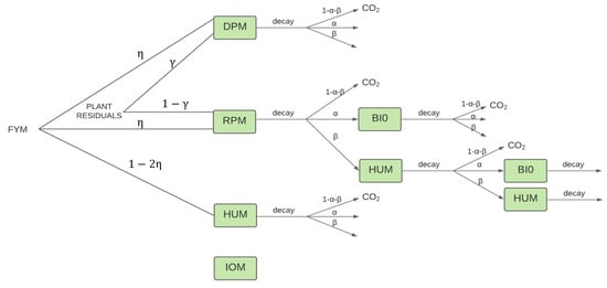 Flow diagram of the Rothamsted Carbon (RothC) model. FYM, Farmyard Manure; DPM, Decomposable Plant Material; RPM, Resistant Plant Material; BIO, microbial Biomass; HUM, Humified organic matter; IOM, Inert Organic Matter.