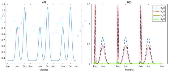 Let us compare long-term solutions obtained by using the original discrete RothC model, the exponential Rosenbrock–Euler method and the novel non-standard first-order scheme. We set parameters , , and . The vector of the decomposition rates and functions , and are supposedly expressed on a monthly scale. They vary with the same period and have Gaussian distributions according to: