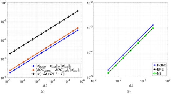 (a) Relative errors of (blue) and (orange) with halved stepsizes, starting from The bounds on the relative error in (10) are also plotted in black. The estimated order of convergence is 1.0037 for the relative error on and 1.0022 for the relative error on SOC. (b) The log-log plot of the norm two errors of the periodic solutions of discrete RothC, Exponential Rosenbrock–Euler (ERE) and Non-Standard (NS) schemes, with respect to the reference solution obtained in the long run with the ode45 Matlab code, at . The estimated orders of convergence are 1.0042, 1.0017 and 1.0018 for the discrete RothC, ERE and NS schemes, respectively.
