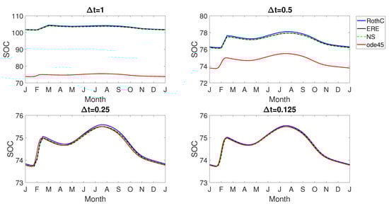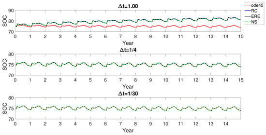 In these experiments, we compared the periodic solutions provided by the three discrete models, obtained for the functions and plotted in Figure 2. Different from the evaluation of steady-state solutions, the ERE and the novel NS procedure, as well as the discrete RothC model provide long-term periodic solutions affected by their own numerical errors, also depending on the chosen stepsize . As shown in Figure 3b, the RothC discrete model provides the worst performance when compared with the other procedures in terms of errors with respect to the reference solution. In Figure 4, we plot the related SOC indicator (1) in a one-period time span obtained with the three discrete procedures applied with reduced stepsizes . In the same figure, the reference solution obtained in the long run with the ode45 MATLAB function, with tolerance set at machine precision, is plotted. Notice that all the methods need to be applied with a in order to have an acceptable level of accuracy when compared to the reference solution. Again, the original discrete RothC model was confirmed as a less accurate integrator of the continuous model (1) with respect to both the ERE and NS models.