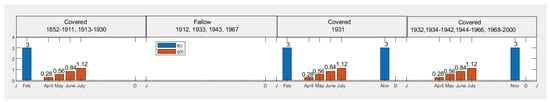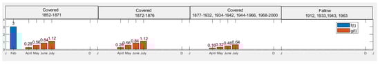 - Mixed treatment, farmyard manure till 1871: In this scenario, farmyard manure was assured every February till 1871 and nothing thereafter. This caused an annual plant residual input equal to hay from 1852 till 1876 and equal to hay in the following years, except for the fallow ones. Input data are shown in Figure 8.