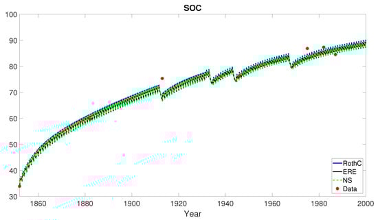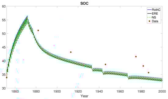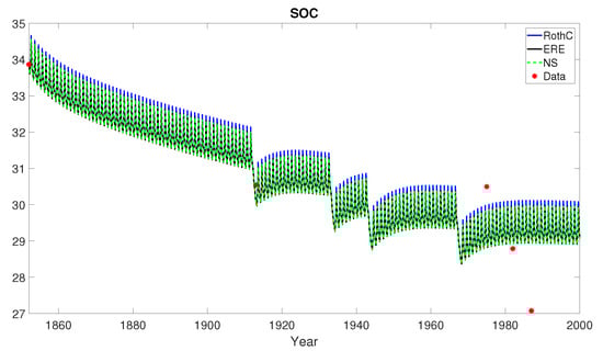 Hoosfield barley experiment. Scenario 2: farmyard manure annually. Organic C in soil data (red bullets) modelled by the RothC (8), ERE (13) and NS (17) methods in the temporal horizon with . According to Table 3, RothC approximation shows the best performance with respect to both the statistical indicators RMSE and EF.