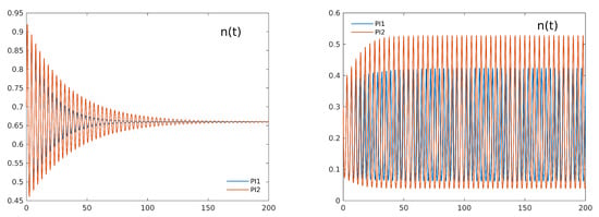 As a preliminary test, we checked the results of all methods in reproducing trajectories when = 1, because these results can be directly compared with the reference solutions given by classical ODE solvers. Even if the considered methods are all devised for fractional-order systems, they are expected to reproduce a good numerical approximation of the solution also for the integer order case. When the parameter settings ( = 3, = 0.3, k = 5) lead to a stable coexistence equilibrium, all methods are able to reproduce the expected trajectories: the left panel of Figure 1 shows the convergence of all numerical approximations of towards the equilibrium value 0.66. On the other hand, when Hopf instability occurs ( = 3, = 10, k = 0.8), the simplest PI1 method shows a sensible damping of the oscillations around the equilibrium 0.188, as shown in the right panel of the same Figure, while the other methods’ trajectories are practically indistinguishable from the reference one (as reported in [14]).