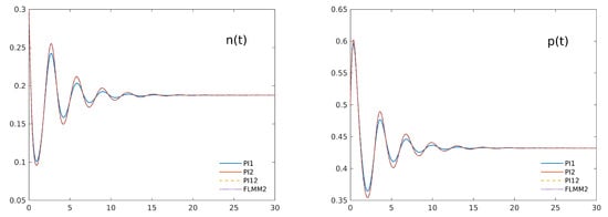 Trajectories for all the numerical approximations of the solutions of system (3) in case = 0.9. While the corresponding ODE systems show instability (see the right panel of Figure 1), the trajectories of the fractional system rapidly stabilizes for both variables ( shown in the left panel, in the right one). The lowest order approximation PI1 clearly shows more damped oscillations, while the higher order approximations are all in excellent agreement.