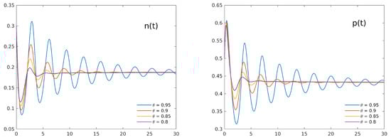 As a second test case, we consider a parameter setting for which the corresponding ODE system shows instability: if we choose as before = 3, = 10, k = 0.8, simply considering a slightly lower value for ( = 0.9) has a powerful stabilizing effect. As Figure 2 shows, all the numerical approximations agree in a fast damping of the oscillations for both the variables. Again, the damping is more evident in the lower order method PI1, while the other considered schemes agree in accurately reconstructing the system trajectories. To further analyze the different performance of the considered numerical methods, we present in the following Figure 3 a detail of the first part of the same trajectories as reconstructed by any of the numerical schemes for decreasing time steps . The less accurate results of PI1 with respect to the other schemes can be clearly seen. Of course, lower values for the fractional-order result in an even faster damping of the oscillations in the trajectories, confirming the strong stabilizing effect of the persistent memory in the model. For the same test case, Figure 4 compares the numerical approximations by PI2 of the populations’ trajectories for different values of the order (0.95, 0.9, 0.85, 0.8), confirming the strong stabilizing effect of the fractional derivative.