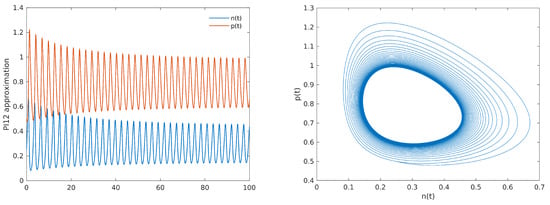 Numerical approximation PI12 of the solutions of system (3) confirming the Hopf instability predicted by the theory in case = 0.92 with = 3, = 3.5, k = 5. In the left panel, the trajectories for both variables are reported as functions of time; the right panel shows the limit cycle in the phase plan.