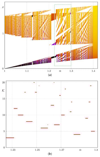 The organizing principles of the presented bifurcation structure are still to be investigated in detail; however, it is worth noticing a striking similarity between this structure and the band count adding structure known for multi-band chaotic attractors. In the latter case, as initially reported in [29] (for more details, we refer to [30]), between two parameter intervals associated with the -band and -band chaotic attractors, there is a parameter interval associated with the -band chaotic attractors. The same regularity can be observed in System (2). For example, in Figure 3b, one can see parameter intervals where the sets consist of three and four bands (connected components), a parameter interval corresponding to sets consisting of six bands in between, and so on. However, there is a major difference in the case described in the literature, as the band count adding structure has been so far reported for chaotic attractors only, while the sets in System (2) are not chaotic. To the best of our knowledge, a band count adding structure formed by non-chaotic attractors has never been reported before. To which extent the bifurcation scenario observed in System (2) follows the regularities of the band count adding structure is still to be investigated.