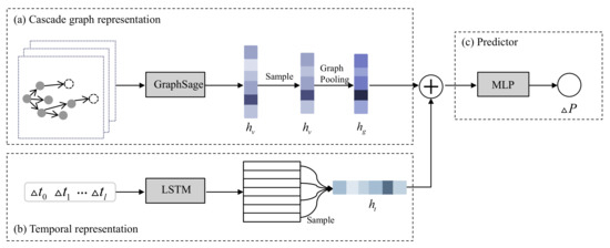 An overview of our proposed model. (a) Cascade graph representation: converts cascade graph information into low dimensional representation, i.e., cascade graph representation; (b) Temporal representation: learns temporal information based on LSTM neural network; (c) Predictor: maps cascade graph representation and temporal representation to popularity.