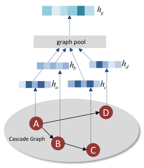 Recent studies [7,13,14,15,16] focus on learning the cascade graph level representation using graph neural networks. Recurrent cascades convolutional network—CasCN [7] propose to model the cascade graph with Graph Convolutional Network [41] and use LSTM neural network to model the dynamic changing characteristic from the sequence of cascade graph snapshots. Similarly, Cascade2vec [13] use Graph Residual block to learn the cascade graph representation and employ recurrent neural network to learn the temporal dependencies between cascade graph snapshots. Graph Attention Network (GAT) [42] is used in DMT-LIC [15] which makes micro and macro prediction simultaneously, DMT-LIC captures both the information of cascade graph and infected user sequence in the diffusion process. However, cascade graph representation in these graph neural network based methods is usually generated by a simple graph pooling strategy such as average or sum operation, which cannot distinguish user importance and results in inefficient cascade graph representation.
