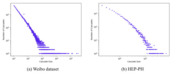 - Sina Weibo: The dataset contained all microblogs posted on 1 June 2016, all their retweets and the corresponding retweet time within 24 h were recorded. The node in the cascade graph was the user who retweeted the microblog, and the edge between users represented their retweet relationship. Following previous works, we filtered out tweets posted in the midnight since they usually gained less attention due to less active users online. We also dropped microblogs whose retweet number was less than 10 or more than 1000 within the observation time window, because large cascades were rarely few in number and might have dominated the training process.