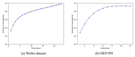 As we can see from Figure 4, the distribution of cascade size followed a power-law distribution, and most information cascades’ size was small. Figure 5 shows the average cascade size at different time normalized by the final average cascade size. As we can see, the microblog’s popularity already reached 80% after 10 h since it was posted, so we set our observation time to be 1 h, 2 h, and 3 h when the normalized popularity was less than 60% to avoid saturation within the observation time window. We chose the observation time for HEP-PH dataset to be 3 years, 5 years and 7 years for the same reason.