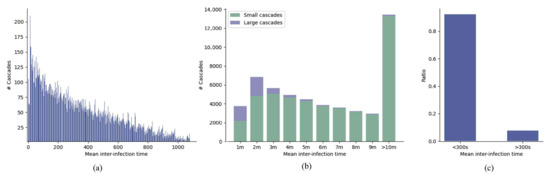 We calculated the distribution of the mean inter-infection time and cascade size for the microblog dataset. Mean inter-infection time was defined as , where M is the number of users in the cascade. Figure 6a illustrate the distribution of mean inter-infection time. As shown in Figure 6b, most large cascades (cascade size was large than 100) had a quite small mean inter-infection time—less than 4 min. Furthermore, we calculated the actual ratio of large cascades based on mean inter-infection time in Figure 6c. More than 90% large cascades in the microblog dataset were propagated with a mean inter-infection time less than 300 s. The statistical results showed that temporal information such as mean inter-infection time was highly correlated with future popularity.